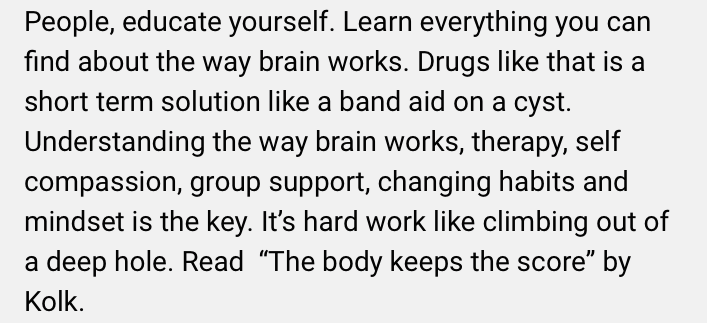 While I’m glad that last commenter is content to live their life sober, I’m also glad that I have access to medically supervised ketamine infusions. I didn’t start ketamine infusions so that every day can be “sunshine and lollipops, cherries and all that stuff.” I did it so I could stay alive. So that I wouldn’t spend every waking moment in crushing depression anymore. Let’s not minimize the suffering that people with treatment-resistant depression endure.