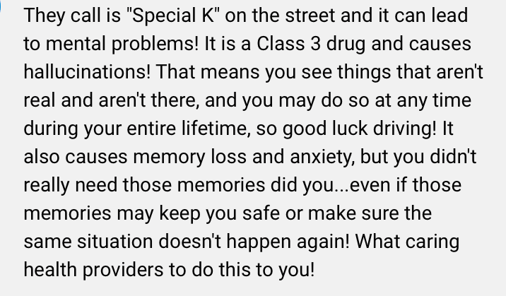 The comments I’ve highlighted here may come from people who have experience with addiction and a strong bias against the use of ketamine. They have a right to their opinions, and I hear their concern. Ketamine is a schedule-III drug that should continue to be handled carefully in medical settings. When people come to a judgment about something without being informed and then leave comments intended to divide through fearmongering, insulting assumptions, and straight-up incorrect information, it moves all of us back in the fight against mental illness stigma.